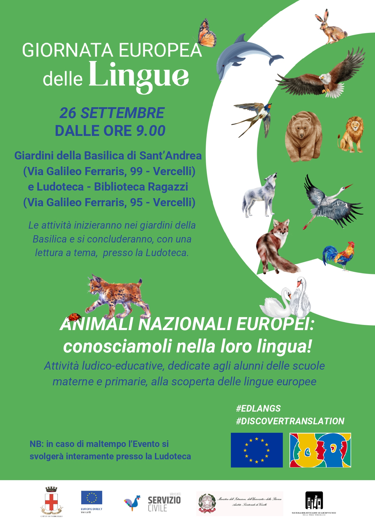 Il 26 settembre è ufficialmente la Giornata europea delle Lingue, una ricorrenza volta a promuovere il multilinguismo e il multiculturalismo all’interno dell’Unione Europea. Il Centro Europe Direct del Comune di Vercelli organizza l’iniziativa: “Animali nazionali europei: conosciamoli nella loro lingua!” che si svolgerà dalle 9 alle 12.