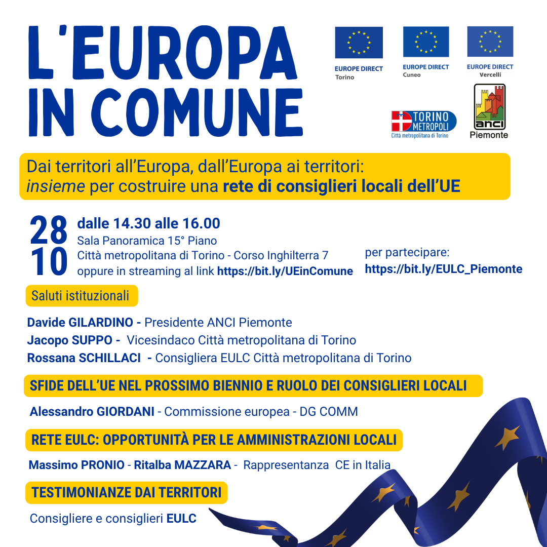 Si è svolto martedì 28 ottobre 2025, nella Sala Panoramica della Città metropolitana di Torino e in diretta streaming, l’incontro “L’Europa in Comune”, promosso da Europe Direct Torino in collaborazione con ANCI Piemonte, Europe Direct Cuneo ed Europe Direct Vercelli.